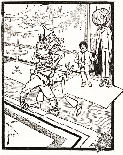 The child had no playmates, so he did not know that boys often dig out the inside of a "pumpkin-jack," and in the space thus made put a lighted candle to render the face more startling; but he conceived an idea of his own that promised to be quite as effective. He decided to manufacture the form of a man, who would wear this pumpkin head, and to stand it in a place where old Mombi would meet it face to face.