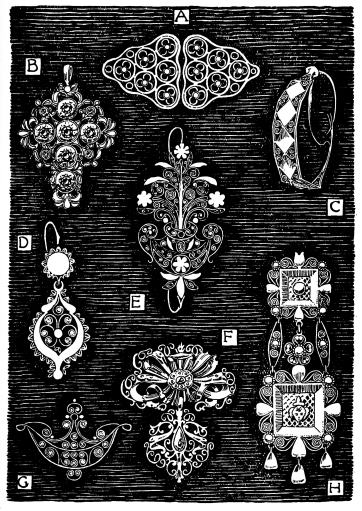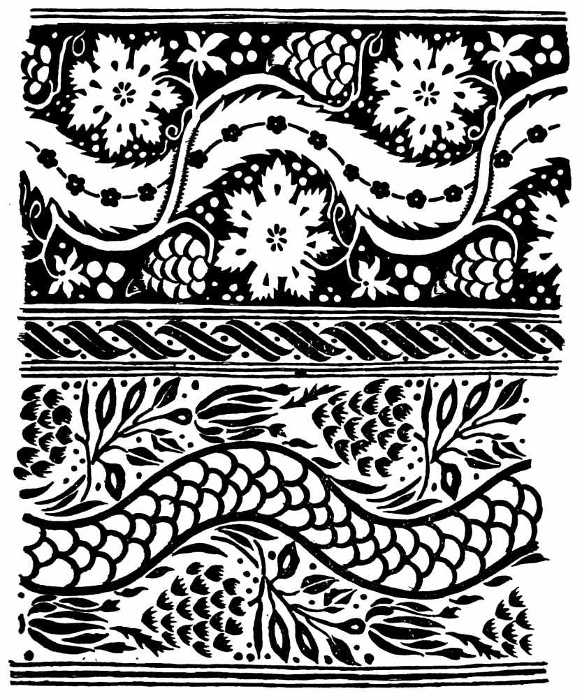 | Natural Attraction, p. 288—Decorative Materials, p. 289—Justification of Treatment, p. 290—Undesirable Imitation, p. 291—Technical Considerations—Methods of Expression, p. 292—Treatment of Leaves, p. 293—Surface Interest—Painted Decoration, p. 294—Stencilled Work, p. 295—Mechanical Production—Printed and Woven Fabrics—Needlework—Appliqué, p. 296—Lace-Wood Inlay—Intarsia, p. 297—Veneer—Marquetry—“Boule” Work, p. 298—Mosaic, p. 299—Byzantine use of Marble—Book Decoration, p. 300—Bindings—Relief Work—Economic Result of Method—Desirable Treatment in Carving, p. 301—Backgrounds, p. 303—Reproduction Processes—Metal Repoussé, p. 304—Cast Metal, p. 306—Character of Cast Work, p. 307. | ||