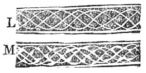 Diagrams I and J represent the appearance of counterfeit Medallions when magnified. K represents the appearance of a genuine Medallion as magnified 10 to 15 times. Every line is full length, and exactly of the same size. In J the lines break off and fork together all through the midst of the pattern, and[23] some lines a little coarser than others, which gives it a scratchy appearance.