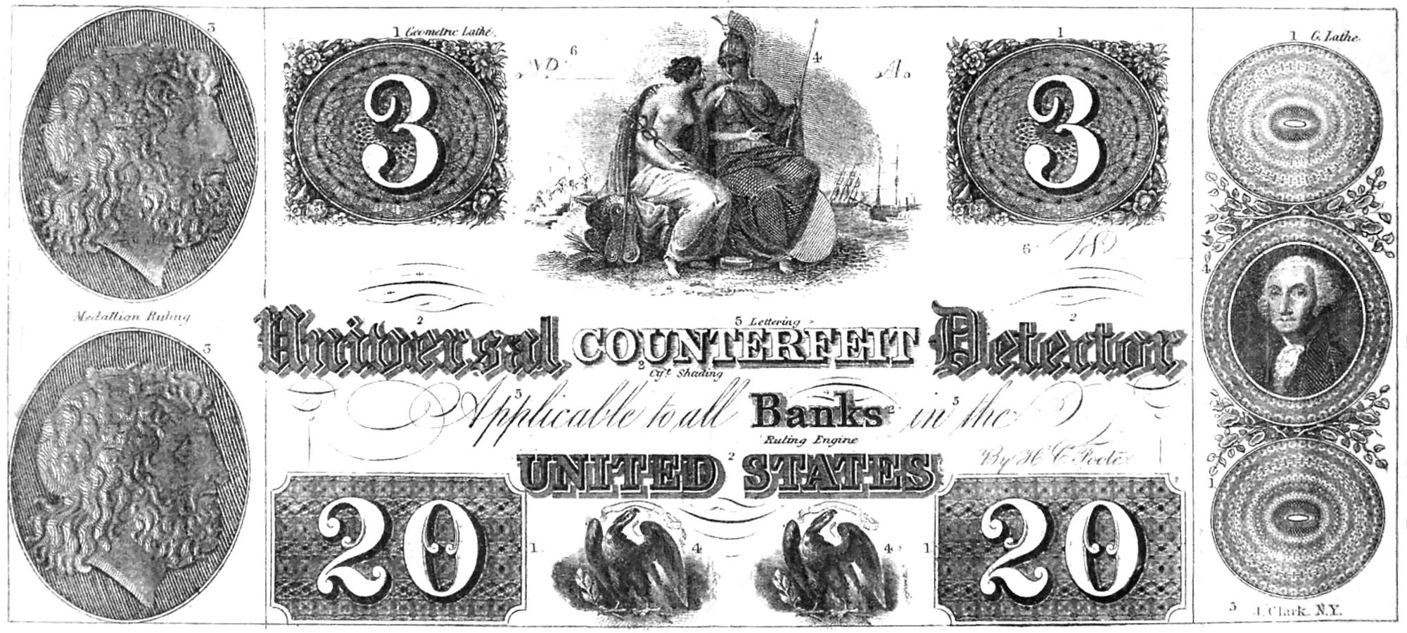 Counterfeit Detector.—Our readers will notice in another column the advertisement of H. C. Foote’s Universal Counterfeit Detector. We have examined the system, and have no hesitation in stating that it will do more than all others now in use towards ridding the country of counterfeit notes. The instructions which accompany the magnifying glass will enable a person, with very little trouble, to determine between good and bad notes. We notice among those who have recommended the system, the names of F. W. Edmonds, Esq. Cashier of the Mechanics’ Bank, N. Y.; E. H. Arthur, Esq. of the Union Bank; C. S. Sloane, Broker, Wall street, and many other prominent money dealers. From what we can learn, we should think it a subject of universal interest.—Scientific American.