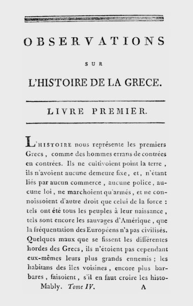 Laissez vos Grecs, m’a-t-on dit plusieurs fois, leur histoire est usée. Qui ne connoît pas Lacédémone, Lycurgue, Athènes, Solon, Thèbes, Epaminondas, la ligue des Achéens et Aratus? On est las d’entendre parler de la bataille de Salamine et de la guerre du Péloponèse. Pouvois-je, mon cher abbé, me rendre à ces conseils? Quand on a mal réussi en traitant un beau sujet, est-il possible de ne pas recommencer son ouvrage? J’aurois pu laisser mes Observations sur les Grecs, telles qu’elles étoient, s’il n’avoit été question que de corriger des fautes d’écrivain; mais il falloit ne pas IV laisser subsister une doctrine dangereuse: des maximes fausses en politique intéressent trop le bonheur des hommes pour qu’un auteur ne doive pas se rétracter quand il parvient à connoître la vérité.
