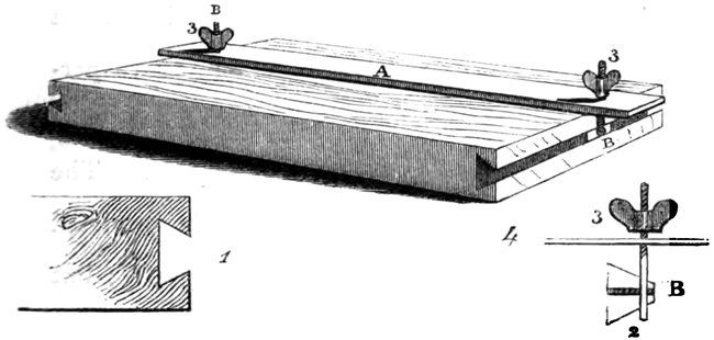 No. 1 is a section of the cutting-board, showing the groove in which the piece of brass runs. 2, The brass, to which is attached the thumb-screws, by means of a screw through the eye at B. 3 3 3, Thumb-screws, to screw down the ruler upon the paper. The brass rule should not be less than an eighth of an inch in thickness, otherwise it may bend; if steel it will do a little less.