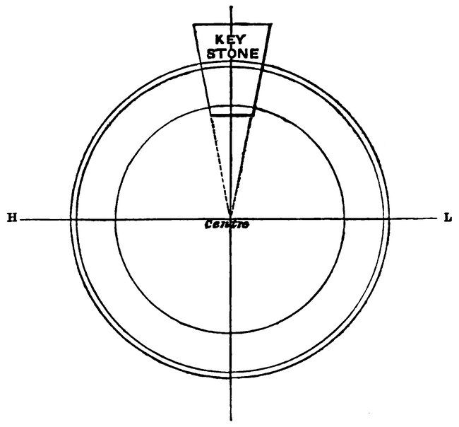 The circular architraves must be formed by cutting, with the little instrument previously described as a knife-compass (page 36), circles of different diameters and thicknesses of paper suited to the mould to be represented; gum together while in the circle, as shown below, the horizontal divisional line being marked, and the radiating lines for the insertion of the keystones. 66When dry cut off by the divisional line, and then the segments, by the lines at each side of the keystone. The key must be of paper sufficiently thick to allow of the highest mould of the architrave abutting against it, and either left plain, cut diamond-wise, or carved, or any other way the fancy may suggest or the design demand.