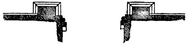 Commence the preparation of the quoins (fig. 6, p. 61) by cutting pieces the required thickness and width of both long and short quoins, and in long strips, with the height of each one marked up its length previously by the dividers.[3] Cut first the 65requisite splay at the edge of the quoin, along the whole length both sides. Cut where marked for height, and splay top and bottom. They are then finished, and may be at once fastened to the work.