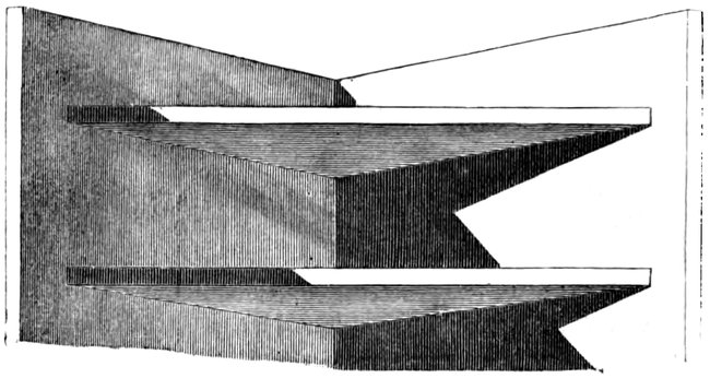Hollows.—In forming hollows in mouldings, &c., if large, proceed as described under the head of Arch; if small, first cut by means of the “adjusting straight-edge,” an angle, thus, V; and then with a curved ivory tool give it the required concavity by pressure along the whole length of the previously cut angle.