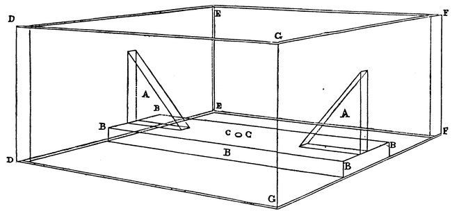 A A Cardboard angle stays.      B B B B B Wood stay by which the model is affixed to its stand by a screw passing through at C C.      D E F G Sides of model.
