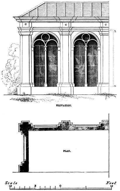 59The two principal elevations are given to the same scale as the plan (page 41); but in order to insure our being understood, the principal portions of the details are given to a larger scale.