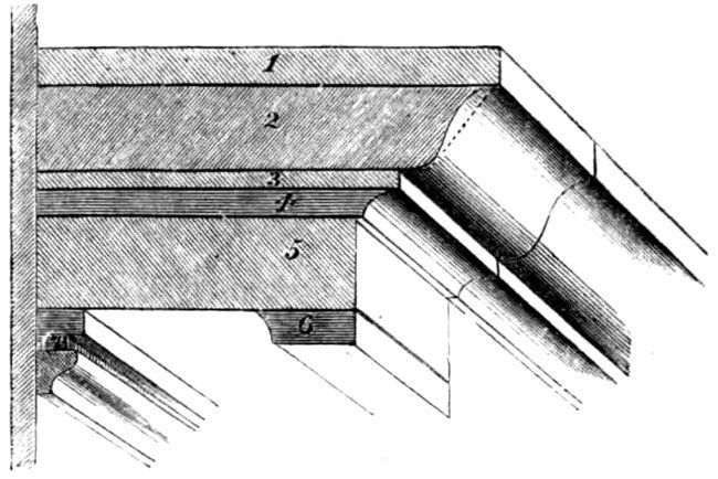 Cornices.—The construction of cornices is fully described in that of the House, illustrated, and also under the head of Arch, where a cornice is described as illustrating the formation of moulded arches.