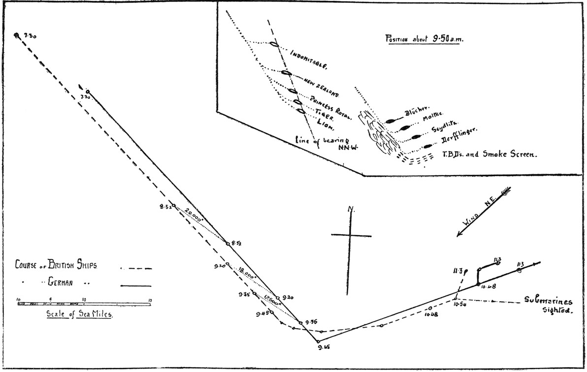 It was already obvious that rapidity would be vital. The weather conditions had been growing more and more unfavourable to the gunnery on which the British Fleet316 would rely for victory. Everything pointed to the conditions growing steadily worse. It was a case of seizing victory quickly or missing it altogether. Had there been no shifting mists there would have been two and a half or three hours of daylight on which to count. But with lowering clouds and heavy vapours, clear seeing at 10,000 or even 5,000 yards might be as impossible two hours before as two hours after sunset. Everything pointed, therefore, to this: the British attack would have to be instant—or it might not materialize at all. The Vice-Admiral commanding the Battle-Cruiser Fleet saw his duty clearly and simply. But to decide exactly what action he should take was a different thing altogether.