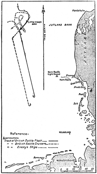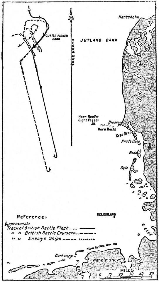 “At daylight, June 1, the Battle Fleet, being then to the southward and westward of the Horn Reef, turned to the northward in search of enemy vessels and for the purpose of collecting our own cruisers and torpedo-boat destroyers.... The visibility early on June 1 (three to four miles) was less than on May 31, and the torpedo-boat destroyers, being out of visual touch, did not rejoin until 9 A.M. The British Fleet remained in the proximity of the battlefield and near the line of approach to German ports until 11 A.M. on June 1, in spite of the disadvantage of long distances from fleet bases and the danger incurred in waters adjacent to enemy coasts from submarines and torpedo craft. The enemy, however, made no sign, and I was reluctantly compelled to the conclusion that the High Sea Fleet had returned into port. Subsequent events proved this assumption to have been correct. Our position must338 have been known to the enemy, as at 4 A.M. the fleet engaged a Zeppelin for about five minutes, during which time she had ample time to note and subsequently report the position and course of the British Fleet. The waters from the latitude of the Horn Reef to the scene of the action were thoroughly searched.... A large amount of wreckage was seen, but no enemy ships, and at 1:15 P.M., it being evident that the German Fleet had succeeded in returning to port, course was shaped for our bases, which were reached without further incident on Friday, June 2.”