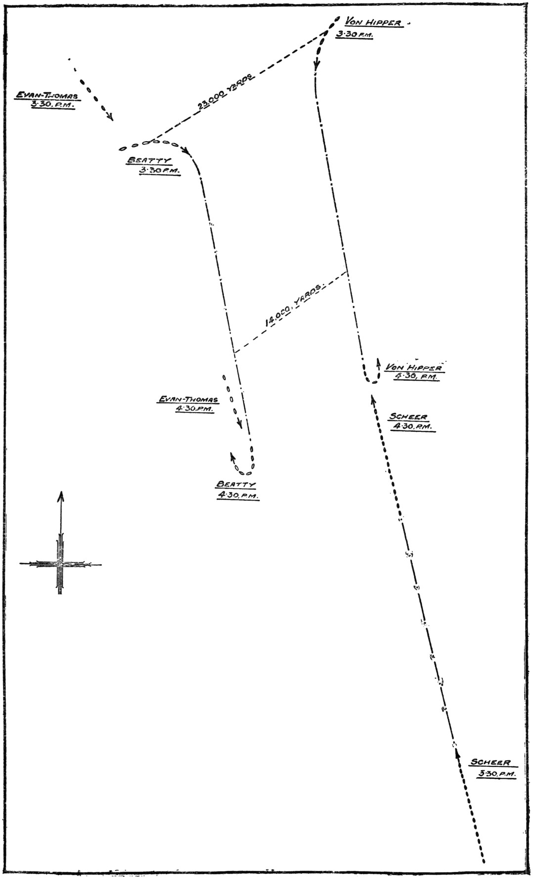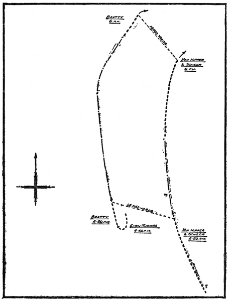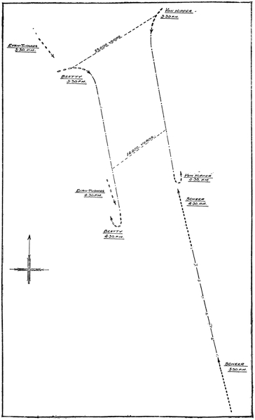 What was the distance at this period that separated the battle-cruisers of each side from their supporting battle-fleets? At 3:30 the German battle-cruisers headed straight for their main fleet at full speed, and met them an hour and a quarter afterward. If Von Hipper’s speed was 26 knots and Admiral Scheer’s 18—he had pre-Dreadnoughts with him, and it was not likely to have been greater—there would have been fifty-five sea miles298 separating the German forces. According to the despatch, Sir John Jellicoe at 3:30 headed his fleet toward Sir David Beatty, and came down at full speed. He came into contact with the battle-cruisers on their return from their excursion to the south at 5:45. Sir David Beatty would by this time have returned approximately to the same latitude he was on at 3:30. Had he then at 3:30 closed Sir John Jellicoe at full speed, he would have come in contact with him in, say, fifty minutes. The British fleets at 3:30, then, may have been between forty and forty-five sea miles apart, against the German fifty-five.