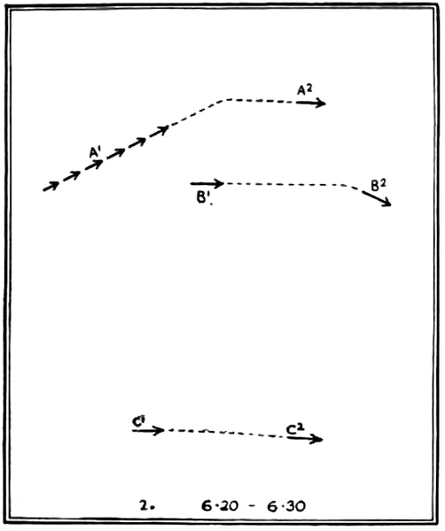 The two quotations I have made from Sir David Beatty’s despatch divide themselves naturally in this way. The first deals with the plan he had attempted to334 make possible and to share, the second describes his course after that plan had proved abortive. Between them they make it clear that Sir David kept an easterly course at full speed from six o’clock till 6:25. He then turned a quarter of a right angle to the south, that is, to his right, and held this course for twenty-five minutes when, having lost sight of the enemy and, the Grand Fleet being still three miles from him, he dropped his speed from say twenty-seven or twenty-eight knots and awaited developments. As soon as he heard that the Grand Fleet, after recovering from the first torpedo attack, had turned south in pursuit of the Germans, he increased his speed by four knots, hauled round to the southwest, found and re-engaged the enemy at 7:14. By this time, as we have seen, the enemy’s whole line would be following the leading ships on a southwesterly course, so that Sir David Beatty’s movements between 6:0 and 7:14 were approximately parallel to those of the enemy. He had been able to keep parallel by availing himself of his ten or eleven knots’ superiority between 6:0 and 6:50 and by his four or five knots’ superiority between 7:0 and 7:14.