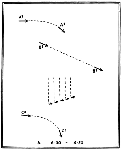 The Grand Fleet came upon the scene in six divisions on a S.E.-by-S. course. This means that the six divisions were parallel with the leading ships in line-abreast, with an interval of approximately a mile between each division. A line drawn through the leading ships and continued to the west would have cut the line of Sir David Beatty’s course after six o’clock, if that also had been similarly continued, making an angle of about 33 degrees. The division on the extreme right, led by Marlborough, flagship of Vice-Admiral Sir Cecil Burney, sighted Sir David Beatty’s squadron at six o’clock. At the same time Sir David reported the position of the enemy’s battle-cruisers, three of which were still at the head of the German line. The speed of the Grand Fleet was probably at least twenty knots, if not twenty-one. The six divisions seem to have continued their former course for ten or twelve minutes, when all the leading ships turned eight points—or a right angle—together to port, the second, third,329 and fourth ships in each division following their leaders in succession, so that, very few minutes after the leading ship had turned, the fleet would be on a line at right angles to its former course, and steering N.E. by E. If the leading ship continued on the new course, the fleet would then be heading at an angle of 56 degrees away from the enemy. A fleet so deployed would now be brought into action by the leading ship turning again, either to a course parallel with the enemy or converging towards it.