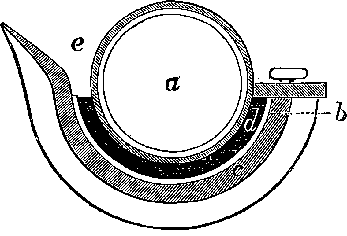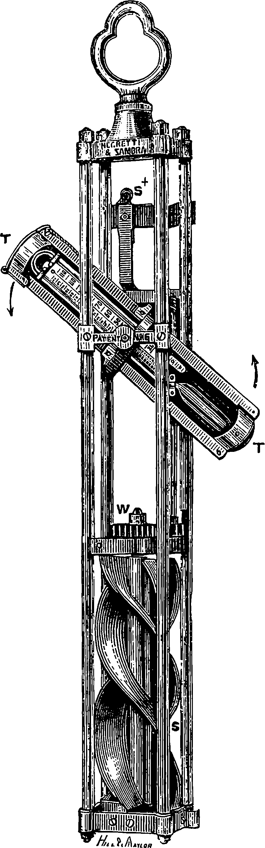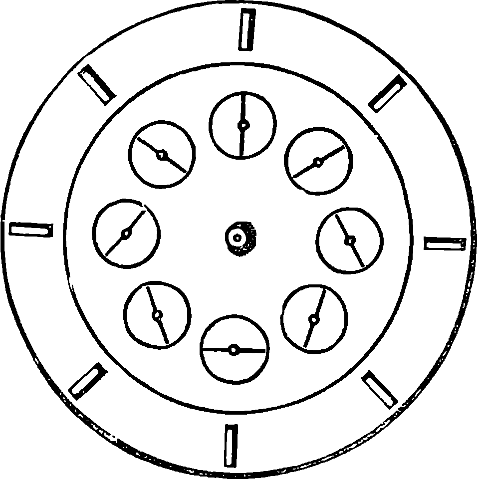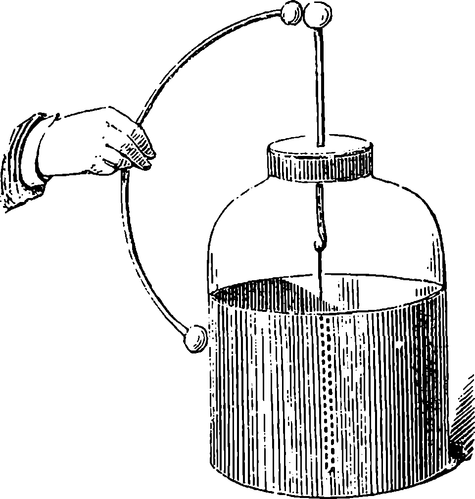 Dr. Joule arranged paddles of brass or iron, so that they could turn freely in a circular box containing water or quicksilver. From the sides of the box partitions projected inwards, which contained openings that permitted the divided arms of the paddle to pass, and preventing the liquid from 805moving en masse, thus caused a churning action when the paddle was turned. Now, every one who has worked a rotatory churn knows that a considerable resistance is offered to this action; but every one does not know that under these circumstances the liquid becomes warmer. It was Dr. Joule’s object to discover how much the temperature of his liquid was raised by a measured quantity of work. He used very delicate thermometers, and had to take a number of precautions which need not here be described; and he obtained the definite quantity of work by the descent of a known weight through a known distance, a cord attached to the weight being wound on a drum, which communicated motion to the paddle. The experiments were conducted with varying circumstances, to avoid chances of error, and were repeated very many times until uniform and consistent indications were always obtained. The result of the experiments showed that 772 units of work (foot-pounds) furnished heat which would raise the temperature of 1 lb. of water from 32° to 33° F., which is the unit of heat. This number, 772, is a constant of the greatest importance in scientific and practical calculations, and is called “the mechanical equivalent of heat.” The amount of work it represents is sometimes called a “Joule,” and is always represented in algebraical formulæ by “J.” Mr. Joule’s first paper appeared in 1843, and soon afterwards various branches of the subject of “The Equivalence and Persistence of Forces” were taken up by a number of able men, who have advanced its principles along various lines of inquiry. Among the most noted contributors to this question we find the names of Sir William Thomson, Helmholtz, James Thomson, Rankin, Clausius, Tait, Andrews, and Maxwell.