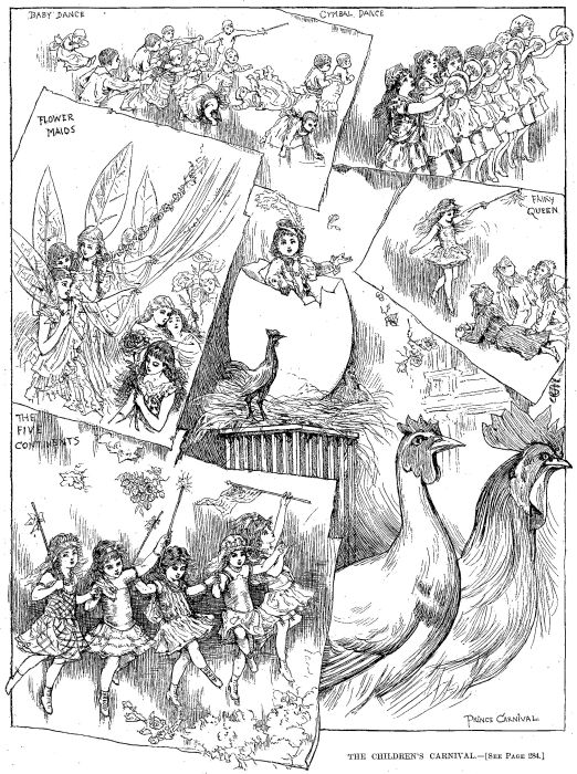 But suppose I ask you to fancy that you are with me at the Academy of Music in New York on the eve of St. Valentine's Day. Beautiful music is heard in the distance, and presently a gauzy curtain is lifted up, and disappears out of sight. Then the music grows louder, as an immense army of fairies and goblins is seen, from the midst of whom a graceful figure issues forth, and dances along in front until he comes to a huge hen's nest, on which is lying a great white egg. The Court Jester—for that is his name—stops when he comes to the egg, hits it with his staff, and, lo! the top falls off, and Prince Carnival, a ruddy little fellow about six years old, is seen waving his wand for the fun to begin.