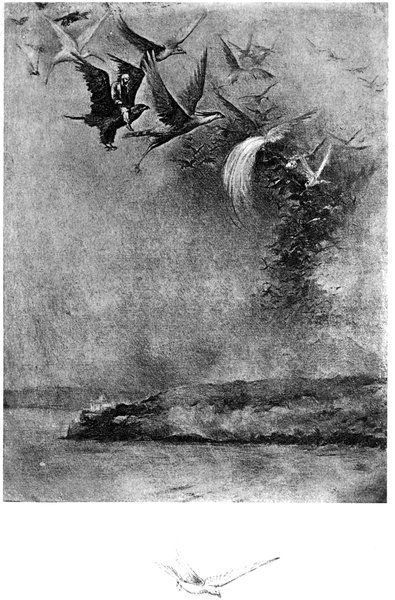 Know, O my brothers, that when I had been awhile on shore after my fourth voyage; and when, in my comfort and pleasures and merry-makings and in my rejoicing over my large gains and profits, I had forgotten all I had endured of perils and sufferings, the carnal man was again seized with the longing to travel and to see foreign countries and islands.[56] Accordingly I bought costly merchandise suited to my purpose and, making it up into bales, repaired to Bassorah, where I walked about the river-quay till I found a fine tall ship, newly builded with gear unused and fitted ready for sea. She pleased me; so I bought her and, embarking my goods in her, hired a master and crew, over whom I set certain of my slaves and servants as inspectors. A number of merchants also brought their outfits and paid me freight and passage-money; then, after reciting the Fatihah we set sail over Allah’s pool in all joy and cheer, promising ourselves a prosperous voyage and much profit. We sailed from city to city and from island to island and from sea to sea viewing the cities and countries by which we passed, and selling and buying in not a few till one day we came to a great uninhabited island, deserted and desolate, whereon was a white dome of biggest bulk half buried in the sands. The merchants landed to examine this dome, leaving me in the ship; and when they drew near, behold, it was a huge Rukh’s egg. They fell a-beating it with stones, knowing not what it was, and presently broke it open, whereupon much water ran out of it and the young Rukh appeared within. So they pulled it forth of the shell and cut its throat and took of it great store of meat. Now I was in the ship and knew not what they did; but presently one of the 49passengers came up to me and said, “O my lord, come and look at the egg that we thought to be a dome.” So I looked and seeing the merchants beating it with stones, called out to them, “Stop, stop! do not meddle with that egg, or the bird Rukh will come out and break our ship and destroy us.”[57] But they paid no heed to me and gave not over smiting upon the egg, when behold, the day grew dark and dun and the sun was hidden from us, as if some great cloud had passed over the firmament.[58] So we raised our eyes and saw that what we took for a cloud was the Rukh poised between us and the sun, and it was his wings that darkened the day. When he came and saw his egg broken, he cried a loud cry, whereupon his mate came flying up and they both began circling about the ship, crying out at us with voices louder than thunder. I called to the Rais and crew, “Put out to sea and seek safety in flight, before we be all destroyed.” So the merchants came on board and we cast off and made haste from the island to gain the open sea. When the Rukhs saw this, they flew off and we crowded all sail on the ship, thinking to get out of their country; but presently the two re-appeared and flew after us and stood over us, each carrying in its claws a huge boulder which it had brought from the mountains. As soon as the he-Rukh came up with us, he let fall upon us the rock he held in his pounces; but the master put about ship, so that the rock missed her by some small matter and plunged into the waves with such violence, that the ship pitched high and then sank into the trough of the sea and the bottom of the ocean appeared to us. Then the she-Rukh let fall her rock, which was bigger than that of her mate, and as Destiny had decreed, it fell on the poop of the ship and crushed it, the rudder flying into twenty pieces; whereupon the vessel foundered and all and everything on board were cast into the main.[59] As for me I struggled for sweet life, till Almighty Allah threw in my way one of the 50planks of the ship, to which I clung and bestriding it, fell a-paddling with my feet. Now the ship had gone down hard by an island in the midst of the main and the winds and waves bore me on till, by permission of the Most High, they cast me up on the shore of the island, at the last gasp for toil and distress and half dead with hunger and thirst. So I landed more like a corpse than a live man and throwing myself down on the beach, lay there awhile, till I began to revive and recover spirits, when I walked about the island and found it as it were one of the garths and gardens of Paradise. Its trees, in abundance dight, bore ripe-yellow fruit for freight; its streams ran clear and bright; its flowers were fair to scent and to sight and its birds warbled with delight the praises of Him to whom belong permanence and all-might. So I ate my fill of the fruits and slaked my thirst with the water of the streams till I could no more and I returned thanks to the Most High and glorified Him;——And Shahrazad perceived the dawn of day and ceased saying her permitted say.