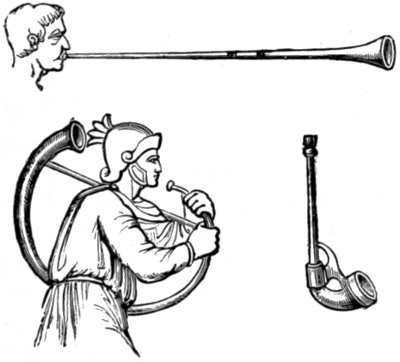 The chorus, or choron, had either one or two tubes, as in the woodcut page 101. There were several varieties of this instrument; sometimes it was constructed with a bladder into which the tube is inserted; this kind of chorus resembled the bagpipe; another kind resembled the poongi of the Hindus, mentioned page 51. The name chorus was also applied to certain stringed instruments. One of these had much the form of the cithara, page 86. It appears however, probable that chorus or 100 choron originally designated a horn (Hebrew, Keren; Greek, Keras; Latin, cornu).