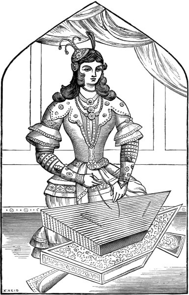 Cithara was a name applied to several stringed instruments greatly varying in form, power of sound, and compass. The illustration represents a cithara from a manuscript of the ninth century, formerly in the library of the great monastery of St. Blasius in the Black Forest. When in the year 1768 the monastery was destroyed by fire, this valuable book perished in the flames; fortunately the celebrated abbot Gerbert possessed tracings of the illustrations, which were saved from destruction. He published them, in the year 1774, in his work “De cantu et musica sacra.” Several 87 illustrations in the following pages, it will be seen, have been derived from this interesting source. As the older works on music were generally written in Latin we do not learn from them the popular names of the instruments; the writers merely adopted such Latin names as they thought the most appropriate. Thus, for instance, a very simple stringed instrument of a triangular shape, and a somewhat similar one of a square shape were designated by the name of psalterium; and we further give a woodcut of the square kind (p. 86), and of a cithara (above) from the same manuscript.
