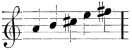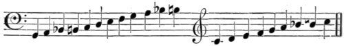 The monochord (p. 100) was mounted with a single string stretched over two bridges which were fixed on an oblong box. The string could be tightened or slackened by means of a turning screw inserted into one end of the box. The intervals of the scale were marked on the side, and were regulated by a sort of movable bridge placed beneath the string when required. As might be expected, the monochord was chiefly used by theorists; for any musical performance 99 it was but little suitable. About a thousand years ago when this monochord was in use the musical scale was diatonic, with the exception of the interval of the seventh, which was chromatic inasmuch as both b-flat and b-natural formed part of the scale. The notation on the preceding page exhibits the compass as well as the order of intervals adhered to about the tenth century.