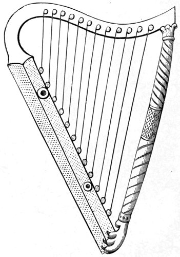 The Anglo-saxons frequently accompanied their vocal effusions with a harp, more or less triangular in shape,—an instrument which may be considered rather as constituting the transition of the lyre into the harp. The representation of king David playing the harp is from an Anglo-saxon manuscript of the beginning of the eleventh century, in the British museum. The harp was especially popular in central and northern Europe, and was the favourite instrument of the German and Celtic bards and of the Scandinavian skalds. In the next illustration from the manuscript of the monastery of St. Blasius twelve strings and two sound holes are given to it. A harp similar in form and size, but without the front pillar, was known to the ancient Egyptians. Perhaps the addition was also non-existent in the earliest specimens appertaining to European nations; and a sculptured figure of a small harp constructed like the ancient eastern harp has been discovered in the old church of Ullard in the county of Kilkenny. Of this curious relic, which is said to date from a period anterior to the year 800, a fac-simile taken from Bunting’s “Ancient Music of Ireland” is given (p. 91). As Bunting 90 was the first who drew attention to this sculpture his account of it may interest the reader. “The drawing” he says “is taken from one of the ornamental compartments of a sculptured cross, at the old church of Ullard. From the style of the workmanship, as well as from the worn condition of the cross, it seems older than the similar monument at Monasterboice which is known to have been set up before the year 830. The sculpture is rude; the circular rim which binds the arms of the cross together is not pierced in the quadrants, and many of the figures originally in relievo are now wholly abraded. It is difficult to determine whether the number of strings represented is six or seven; but, as has been already 91 remarked, accuracy in this respect cannot be expected either in sculptures or in many picturesque drawings.” The Finns had a harp (harpu, kantele) with a similar frame, devoid of a front pillar, still in use until the commencement of the present century.