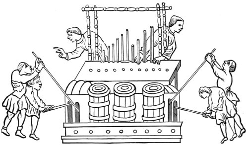 The pneumatic organ is sculptured on an obelisk which was erected in Constantinople under Theodosius the great, towards the end of the fourth century. The bellows were pressed by men 102 standing on them: see page 103. This interesting monument also exhibits performers on the double flute. The hydraulic organ, which is recorded to have been already known about two hundred years before the Christian era, was according to some statements occasionally employed in churches during the earlier centuries of the middle ages. Probably it was more frequently heard in secular entertainments for which it was more suitable; and at the beginning of the fourteenth century appears to have been entirely supplanted by the pneumatic organ. The earliest organs had only about a dozen pipes. The largest, which were made about nine 103 hundred years ago, had only three octaves, in which the chromatic intervals did not occur. Some progress in the construction of the organ is exhibited in an illustration (engraved p. 104) dating from the twelfth century, in a psalter of Eadwine, in the library of Trinity college, Cambridge. The instrument has ten pipes, or perhaps fourteen, as four of them appear to be double pipes. It required four men exerting all their power to produce the necessary wind, and two men to play the instrument. Moreover, both players seem also to be busily engaged in directing the blowers about the proper supply of wind. Six men and only fourteen pipes! It must be admitted that since the twelfth century some progress has been made, at all events, in the construction of the organ.
