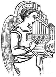 The minstrels’ gallery of Exeter cathedral dates from the fourteenth century. The front is divided into twelve niches, each of which contains a winged figure or an angel playing on an instrument of music. There is a cast also of this famous sculpture at South Kensington. The instruments are so much dilapidated that some of them cannot be clearly recognized; but, as far as may be ascertained, they appear to be as follows:—1. The cittern. 2. The bagpipe. 3. The clarion, a small trumpet having a shrill sound. 4. The rebec. 5. The psaltery. 6. The syrinx. 7. The sackbut. 8. The regals. 9. The gittern, a small guitar strung with catgut. 10. The shalm. 11. The timbrel; resembling our present tambourine, with a double row of gingles. 12. Cymbals. Most of these instruments have been already noticed in the preceding pages. The shalm, or shawm, was a pipe with a reed in the mouth-hole. The wait was an English wind instrument of the same construction. If it differed in any respect from the shalm, the difference consisted probably in the size only. The wait obtained its name from being used principally by watchmen, or waights, to proclaim the time of night. Such were the poor ancestors of our fine oboe and clarinet. 114
