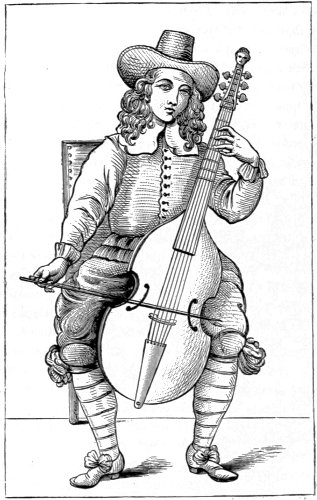 The player on the viola da gamba, shown in the next engraving, is a reduced copy of an illustration in “The Division Violist,” London, 1659. It shows exactly how the frets were regulated, and how the bow was held. The most popular instruments played with a bow, at that time, were the treble-viol, the tenor-viol, and the bass-viol. It was usual for viol players to have “a chest of viols,” a case 118 containing four or more viols, of different sizes. Thus, Thomas Mace in his directions for the use of the viol, “Musick’s Monument” 1676, remarks, “Your best provision, and most complete, will be a good chest of viols, six in number, viz., two basses, two tenors, and two trebles, all truly and proportionably suited.” The violist, to be properly furnished with his requirements, had therefore 119 to supply himself with a larger stock of instruments than the violinist of the present day.