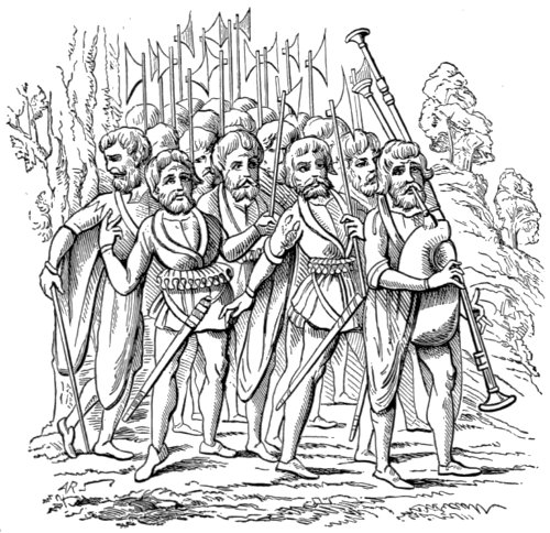 The bagpipe appears to have been from time immemorial a special favourite instrument with the Celtic races; but it was perhaps quite as much admired by the Slavonic nations. In Poland, and in the Ukraine, it used to be made of the whole skin of the goat in which the shape of the animal, whenever the bagpipe was expanded with air, appeared fully retained, exhibiting even the head with the horns; hence the bagpipe was called kosa, which signifies a goat. The woodcut p. 120 represents a Scotch bagpipe of the last century. 120