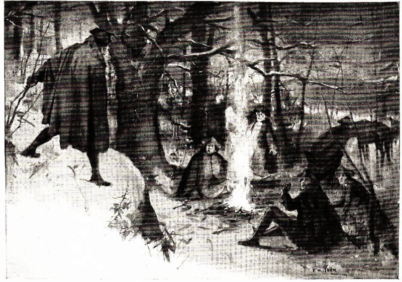 There was a group of rough-looking men seated about a bivouac at the right of a great oak; some leaning forward wrapped in heavy blankets, appeared asleep. Three horses were nibbling at the twigs of the stunted undergrowth. One had strayed to quite a distance, and was standing mournfully leg-deep in the snow. As William came down the hill he found himself at the top of a great rock even with the branches of the oak and overlooking the small fire. He was in full sight when one of the party looked up and saw him. The man's jaw dropped, and he caught his breath, with an exclamation that aroused the drowsy ones about him. One of the men rolled backwards with a howl, and with his blanket trailing behind him plunged down the hill.