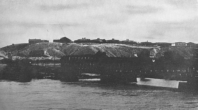 What entitles the post to the name of fort are certain unpretentious intrenchments scattered along the slopes of the bluff overlooking the river and commanding the bottom lands adjacent. They are not visible from the river and the visitor is not aware of their existence until he steps to the edge of the bluff and looks down upon them. The parade is a stony lawn. Not a blade of grass is to be seen and everything is of that ashy light-grey color so trying to the eyes. It is a relief to gaze out upon the green bottom lands through which one passed before ascending to the top of the eminence where stands the fort.