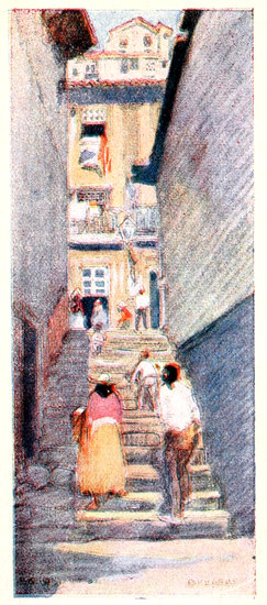 The centre of the Ribeira is the Praça called after it, where a sloping square facing the water opens out. The scene is picturesque in the extreme. The space is thronged by men, either sleeping in their baskets or carrying them filled with fish or merchandise upon their heads: a 11motley, water-side crowd, men of all nations, pass to and fro, or gossip under the vine trellis before the wine shop overlooking the square, and as the observer casts his eyes upwards he sees the gaily coloured houses piled apparently on the top of one another, until at the top of all, as if overhead, is the glaring white palace of the bishop, and the glittering cathedral cross, standing out hard and clear against a sky of fathomless indigo.