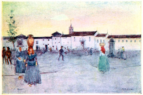 I was bound for the ancient city of Evora, and I could have gone by train to Pinhal Novo junction, where the train to the south was to receive me. But the plain over which Palmella lords it had captivated me, and I decided to traverse by road the ten miles to the junction. As I drove out of Setubal, with its clean white houses, and gaily decked women in a long kneeling row washing their linen in the river, the glamour of the south was over all. Cactus hedges lined the way, the glistening green of the orange trees with the abundant fruit already showing, the bronzed vines and the grey olive orchards chequered the light red earth; the rolling slopes were thickly wooded to the summits, and nestling amidst the verdure on many hill-tops were glistening white houses, abandoned cloisters, or shrines of pilgrimage. The aspect was Andalusian, as were 279the traits of the people, and North Portugal seemed very far away. Before us always towered the huge castle of Palmella, with its tremendous stretches of battlements and square towers, seen first from one side and then from another, as we gradually wound round and round the base of the eminence upon which it stands. The way is always upward, and on all sides spread below us, growing more extensive as we round each successive rising turn of the hill, is the fertile plain and the sea beyond. Wheat, maize, olives, and oranges grow here luxuriantly, the lower folds of the sandy hillsides are covered with vines, and the rich brown velvet trunks of the stripped cork-trees are all along the way.