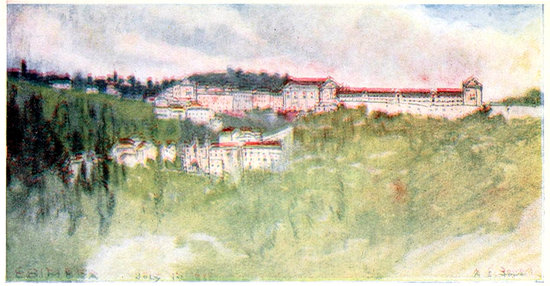 The climate of Lisbon, indeed, is extraordinarily soft and mild relatively to its latitude, owing to its sheltered position and to the prevalence of westerly sea breezes. As a winter resort it has unaccountably fallen somewhat out of fashion of late years in favour of the Mediterranean Riviera, where the climate is 259much less equable and more trying to those in delicate health. The latitude of Lisbon is about the same as that of Palermo, three hundred miles south of that of the Mediterranean Riviera, and the mean winter temperature (December, January, and February) in Lisbon is 10.63° Centigrade (51° Fahrenheit), against 7.79° at Biarritz, and 7.91° at Nice. Not only is Lisbon thus much warmer on an average than the winter resorts now most affected by English visitors, but the climate is more uniform, the diurnal fluctuation in winter being considerably less at Lisbon than at Biarritz, Nice, or even at Palermo in the same latitude. The winter atmospheric humidity of Lisbon slightly exceeds that of Biarritz and Nice, though in summer Lisbon is atmospherically much drier than either: but in the matter of the entire winter rainfall the average of Lisbon is considerably higher, and this it is that to some extent has set English physicians against the place as a winter health resort, although the average rainfall for the whole year is much less at Lisbon[7] than either at Biarritz or Nice. 260The rains in Lisbon, however, which fall heavily in the months of November, December, and January (a mean of 277 milimetres, as against 254 milimetres at Biarritz and 167 milimetres at Nice), are usually rapid and torrential, and pass away at once.