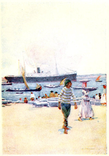 I was glad to embark in my sardine boat again, for the glare and heat of the sun beating down upon the shadeless sand was almost intolerable, 278and the treacherous black sandflies, so harmless looking and so venomous, in the three hours I had been at Troia had rendered my face unrecognisable by my nearest friends, and turned my hands to agonised dumplings. So, with a slight puff of breeze now and again to help us, we slowly crossed the blue bay to Setubal where much needed refreshment awaited me.