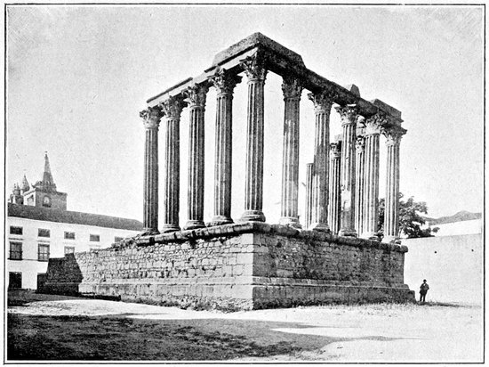 At what was the entrance of the temple the remains of a noble flight of steps, the whole width of the edifice and twelve feet high, exist, and it requires no effort of the imagination, turning one’s back to the cathedral, to repeople the space before us with figures of the long past. Up the steps to the lovely temple under the blue sky mount the white-clad citizens of imperial Rome. Slaves there are in many, and half-civilised Iberian tribesmen, still, perhaps, recalcitrant to the yoke. Trembling, perchance, for the savage vengeance of Diocletian, they sullenly look upon the sacrifice to the pagan gods, whilst they in their hearts hold with the strange new creed of the Nazarene; for this temple must have been raised in the second 300century after the advent of Christ, when already the trumpet sound of Christianity had pierced the hearts of the Celtiberian peoples, and had awakened vague longings for emancipation from the oppressive unconsoling gods of old.