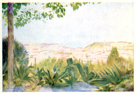 Lisbon is a city of prospects, and, uninteresting as are its main streets, it is only necessary to stand upon one of its many eminences to see spread before you a wide and varied panorama. The end windows of the upper corridors in the Hotel de Bragança afford a splendid view of the port and the mouth of the Tagus, whilst from the ancient citadel of St. Jorge, and from the dome of the big classical church of Estrella, the city and the rolling hills for miles around are spread out at the foot like a map in relief. Speaking for myself, I have always considered one of the most attractive coigns of vantage in Lisbon to be the Largo da Gloria just over the entrance of the Avenida. This can be reached either up the Rua de São Roque or by the funicular lift from the Avenida itself. The view from this pretty public garden on the top of a 244precipitous bluff is charming. The whole of the central valley lies under you with its straight lines of streets, starting from the great parallelogram of the Rocio just below and reaching the Tagus. Just in front of you across the valley rise the hills covered with houses of all colours amidst greenery, with the great old citadel of the Moors and their conquerors crowning the highest point towards the river; the square battlemented towers of the old cathedral being seated upon a lower hill at its foot. To the left an ocean of mountainous hills covered with verdure and buildings stretch as far as the eye reaches; whilst on the right beyond the extensive Black Horse Square shines the wide estuary of the river, and miles away across the water the mountains that bound the prospect towards the south.