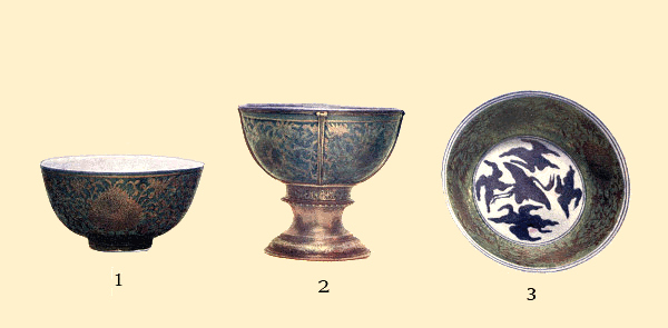 | v. | Chinese, Ming porcelain. Three small bowls with apple-green glaze. Fifteenth or sixteenth century. British Museum. (1) Floral design in gold on green ground. (Diam. 4¾ in.) On base a coin-like mark, inscribed{xiii} Chang ming fu kwei—‘long life, riches, and honour.’ (2) Similar decoration and identical inscription to above (diam. 4¾ in.), set in a German silver-gilt mounting of sixteenth century. (3) Shallow bowl (diam. 5¼ in.). Inside, apple-green band with gold pattern similar to above; in centre, cranes among clouds—blue under glaze. | (To face p. 81.) |