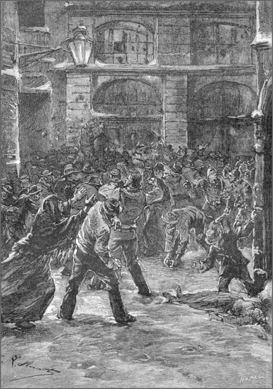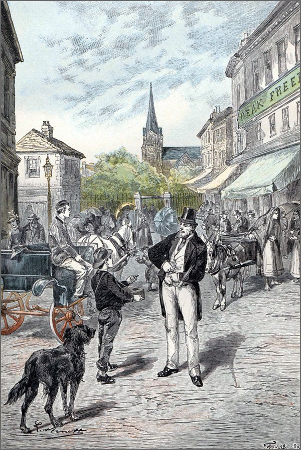 Personne ne sortait des boutiques, personne ne mettait la tête aux fenêtres. Çà et là, quelques haillons apparaissaient entre les ruelles adjacentes, et de ces haillons sortaient des faces hâves et faméliques, aux yeux rougis, profonds comme ces soupiraux à travers lesquels on voit le vide. Puis, il y avait des enfants à peu près nus, et cinq ou six de ces gamins se hasardèrent enfin à rejoindre la charrette de Thornpipe, lorsqu'elle eut fait halte sur la grande allée du mail. Et les voici tous criant: