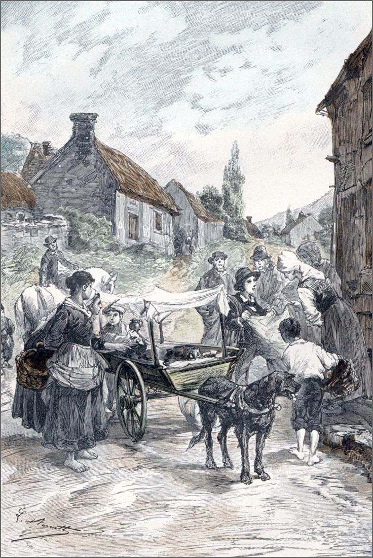 Aucun spectateur sérieux ne se rendant aux invitations réitérées du forain, la charrette reprit sa marche, tirée péniblement par le grand chien efflanqué.