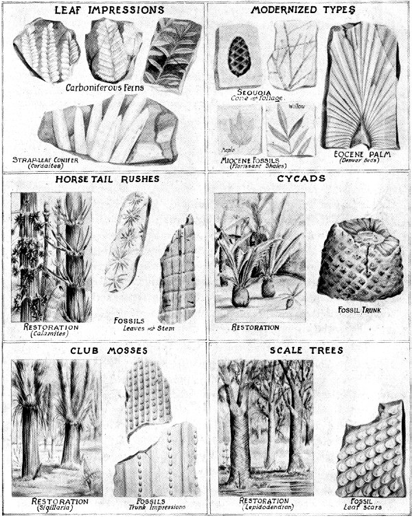 (6) Coal beds often produce fossils of an unusual sort. In the formation of coal, plant material gradually loses some of its more perishable substances but retains carbon which has better lasting qualities and slowly accumulates to produce the seams and beds that are mined. In the early stages of the process the original vegetation undergoes little change in appearance but eventually practically all of its character is lost. Many fossil leaves are found as thin layers of carbon, bedded in the clays which are commonly associated with coal deposits.