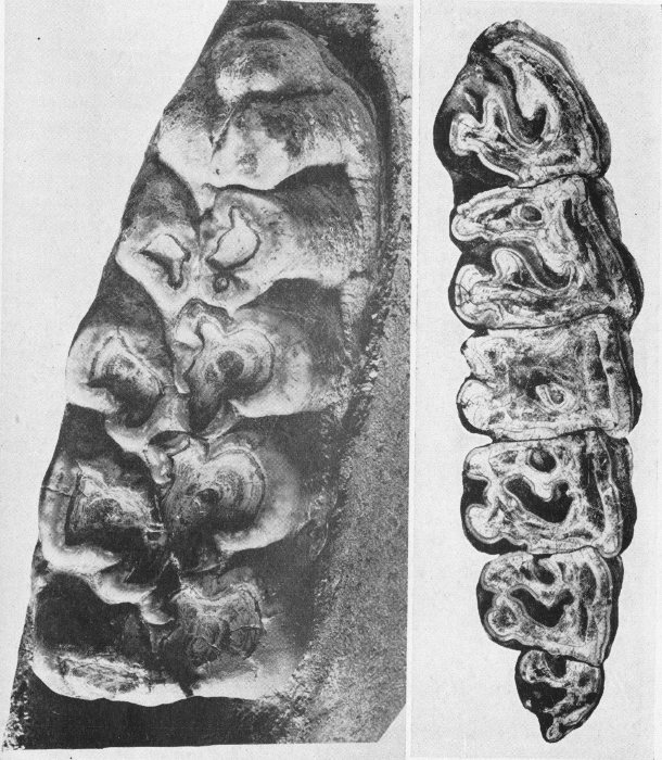 The difference between mastodons and mammoths is most readily recognized in the structure of the grinding teeth, the molars and pre-molars. In the mastodon these teeth are of the short-crowned type, while in the mammoths, as in the modern elephants, they are long-crowned. The difference between these two types of molars has been described with reference to horses, and the change from the older to the modern form may be regarded as coming about in the same general way, through a series of gradual modifications. In both horse and mammoth the final development shows internal enamel extending from the grinding surface nearly to the roots. Otherwise, however, there is almost no resemblance, for the mammoth tooth is made up of flattened enamel plates, the number of which is variable for different species. In the jaws of a very young individual these plates may be seen as separate parts. As the tooth continues to grow, the plates become cemented together, and when the ends of the plate are worn down it may be observed that each consists of a layer of enamel surrounding a flat central core of dentine. The type of construction is rather more obvious in the mammoth tooth than in that of a horse, partly because of the larger size, and partly because of the relative simplicity of construction.