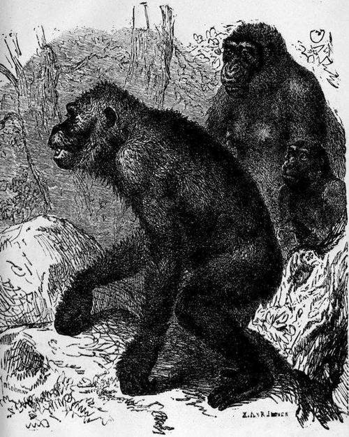 The hands are intended to illustrate the close resemblance between the hand of a gorilla and that of a man belonging to the Hammeghs of the Nubian Soudan. It will be observed that while the fingers of the gorilla are webbed, the second and third fingers of the man are slightly webbed and his thumb and first finger very considerably webbed.