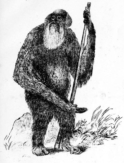 Mafuca, whose portrait is given in the following pages, was a female ape from the Loango coast, placed in the Dresden Zoological Gardens. Hartmann, in his “Anthropoid Apes,” describes her as being “120 cm. in height, reminding us in many respects of the gorilla. The face was prognathous; the ears were comparatively small, placed high on the skull, and projecting outwards; the supra-orbital arch was strongly developed; the end of the nose was broad; and there were rolls of fat on the cheeks.” K. Th. von Siebold also classed her as a gorilla; but Bolau and A. B. Meyer opposed this view; while Bischoff, judging by the structure of the brain, thought she was a chimpanzee. Now it is pretty generally believed that she was either a cross between the gorilla and the chimpanzee, or else a member of a distinct species of anthropoids intermediate between the gorilla and the chimpanzee. In Hartmann’s account of Mafuca we read that she was[Pg 19] “a remarkable creature, not only in her external habits, but in her disposition.... She hardly obeyed anyone except Schöpf, the director of the gardens, and when in a good humour she would sit on his knee and put her muscular arms round his neck with a caressing gesture.... Mafuca was able to use a spoon, although somewhat awkwardly; and she could pour from larger vessels into smaller ones without spilling the liquor. She took tea and cocoa in the morning and evening, and a mixed diet between whiles, such as fruit, sweetmeats, red wine and water, and sugar.... If she was left alone for any time she tried to open the lock of her cage without having the key, and she once succeeded in doing so. On that occasion she stole the key, which was hanging on the wall, hid it in her axilla [arm-pit], and crept quietly back to her cage. With the key she easily opened the lock; and she also knew how to use a gimlet. She would draw off the keeper’s boots, scramble up to some place out of reach with them, and throw them at his head when asked for them. She could wring out wet cloths, and blow her nose with a handkerchief. When her illness began, she became apathetic, and looked about with a vacant, unobservant stare. Just before her death, from consumption, she put her arms round Schöpf’s neck when he came to visit her, looked at him placidly, kissed him three times, stretched out her hand to him, and died.” It may be added to this that Mafuca exhibited the greatest decorum and modesty in the performance of all her daily and other natural functions.