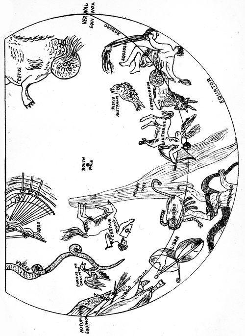 I must acknowledge with gratitude my indebtedness to Mr. John Bennett, of Prince’s Buildings, Dronfield, who has been kind enough to assist me by drawing the zodiacal signs, the Bacchanalian insignia, the oriental and Egyptian zodiacs, Amen-Ra, Mafuca, Aidanill and the negro head, the two hands, the Fuegans, the Australian (2), African and European skulls, and Boötes, Virgo, Cetus, Aquarius and Sagittarius; and also to Mr. Wm. Gill Hall, of 66 Cecil Road, Sheffield, who has kindly drawn for me the single chimpanzee, the orang, the lemur, the face of the proboscis monkey, the moor monkey, the hairy couple from Burmah, the genealogy of man, the earth’s section, and the ascent of mind. The remainder of the illustrations, with the exception of the two zincographs of the gorillas and chimpanzees (the frontispiece), have been drawn by myself; and I must trust to the generosity of my readers to overlook the amateur style of my productions, which, it is hoped, will be found sufficiently well done to serve the purpose for which they are intended. However amateur the illustrations may be in appearance, this I can truthfully say, that every sketch in the book is a faithful reproduction of the original. Some of the illustrations, however, have been derived from such gross originals that it has not been considered advisable, for many reasons, to reproduce the figures in their entirety; but wherever part of a figure has been modified by the substitution of a symbolical or other device the fact has been notified to the reader at the foot of the illustration.