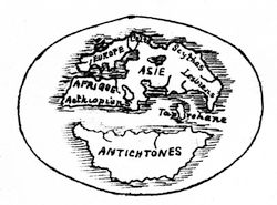 From the discoplacental-mammal Prosimiæ evolved the following species—viz., Prosimiæ of Madagascar (lemurs of to-day), with four feet and claws; Cheiroptera (bats); Rodentia (squirrels, mice, porcupines, hares); Insectivora (moles, shrew-mice, and hedgehogs); and Simiæ, or quadruped monkeys, with two feet, two hands, nails, and tails. We divide Simiæ into two classes, the Platyrrhini, or New World apes, with thirty-six teeth, tails, no cheek-pouches or callosities, and nasal cavities pointing outwards and divided by a thick septum (from which came the American howlers, weepers, capuchins, and squirrel-monkeys); and the Catarrhini (Menocerca), or Old World apes, with thirty-two teeth (like man), tails, cheek-pouches, callosities, and nasal cavities pointing downwards and divided by a thin septum (like man). These are placed in the Meiocene period, in which have been discovered the first fossil apes. From the Catarrhini developed the tailed baboons and macaques, with thirty-two teeth, cheek-pouches, and callosities; and the Anthropoidæ, with thirty-two teeth, but no tails, cheek-pouches, or callosities. These were evolved during the Pleiocene period. From the anthropoid (man-like) apes we get three distinct divisions—viz., the gibbon and orang families, with no tails or cheek-pouches, walking partly on hind legs, and wandering in companies in India; the chimpanzee and gorilla families of Africa, with no tails or cheek-pouches, no articulate speech, walking on hind legs only, living in companies in caves, and carrying their babes in their arms; and Alali, or ape-like men, commonly called the “missing links,” who were probably developed, during the Pleiocene period, in Lemuria, a submerged continent which formerly occupied the position of the Indian Ocean; or in the districts of the Nile and Ganges.