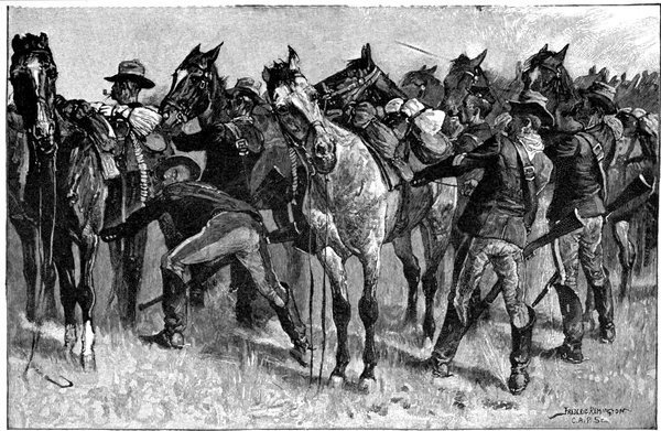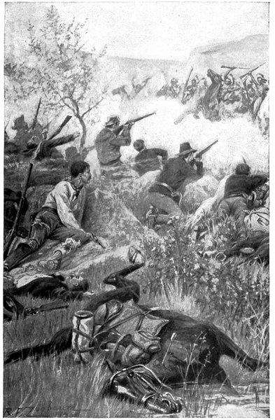 Reno, very properly, gave the command “Battalion halt—prepare to fight on foot—dismount!” He directed French to send ten men from the right of his troop to skirmish the woods, before the “numbers four” proceeded there with the horses. We immediately deployed as skirmishers and opened fire. The odds were at least thirty to one, as our line with the fours out did not exceed seven officers and ninety men. We had, however, a few Indian scouts and civilians. We had entire confidence in our officers and in ourselves, and went to work smiling and as cool as if we were at target practice. In less time than it takes to relate it, the Indians were on three sides of us. We were ordered to lie down, and every man that I could see, except Reno and French, were fighting lying down. Reno walked along the line giving instructions to the men, while French was calling his men’s attention to his own marksmanship with an infantry long-tom that he carried.