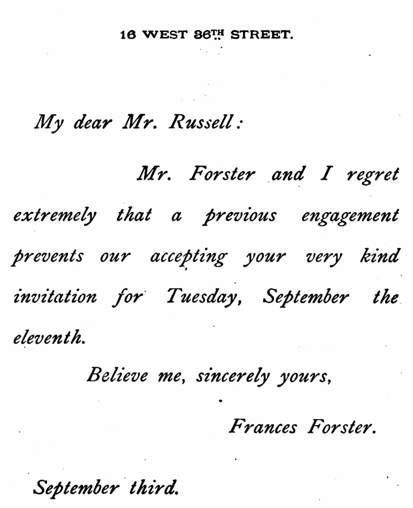 ANOTHER STYLE OF FORMAL REGRET TO A FORMAL INVITATION TO A DINNER.