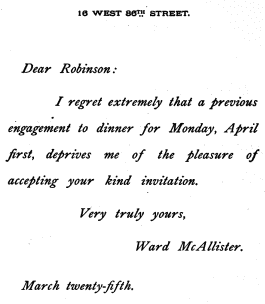 ANOTHER STYLE OF A FORMAL REGRET TO A FORMAL INVITATION TO A DINNER.