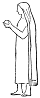 The women of the patriarchal age wore long straight-cut robes, longer than those of the men, gathered round the waist by means of a cord or narrow sash. They would have a cloth on their heads, falling a long way down the back; and the young women would probably have their arms bare.