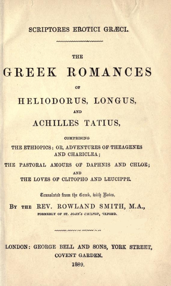 The publication of a revised translation of Heliodorus and Longus, and of a new translation of Achilles Tatius, calls for some brief prefatory observations upon the origin of fictitious narrative among the Greeks; that department of literature which, above any other, has been prolific in finding followers, more especially in modern times; and which, according to the spirit in which it is handled, is capable of producing some of the best or worst effects upon society.